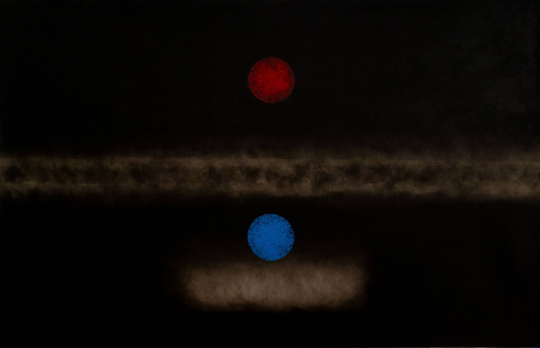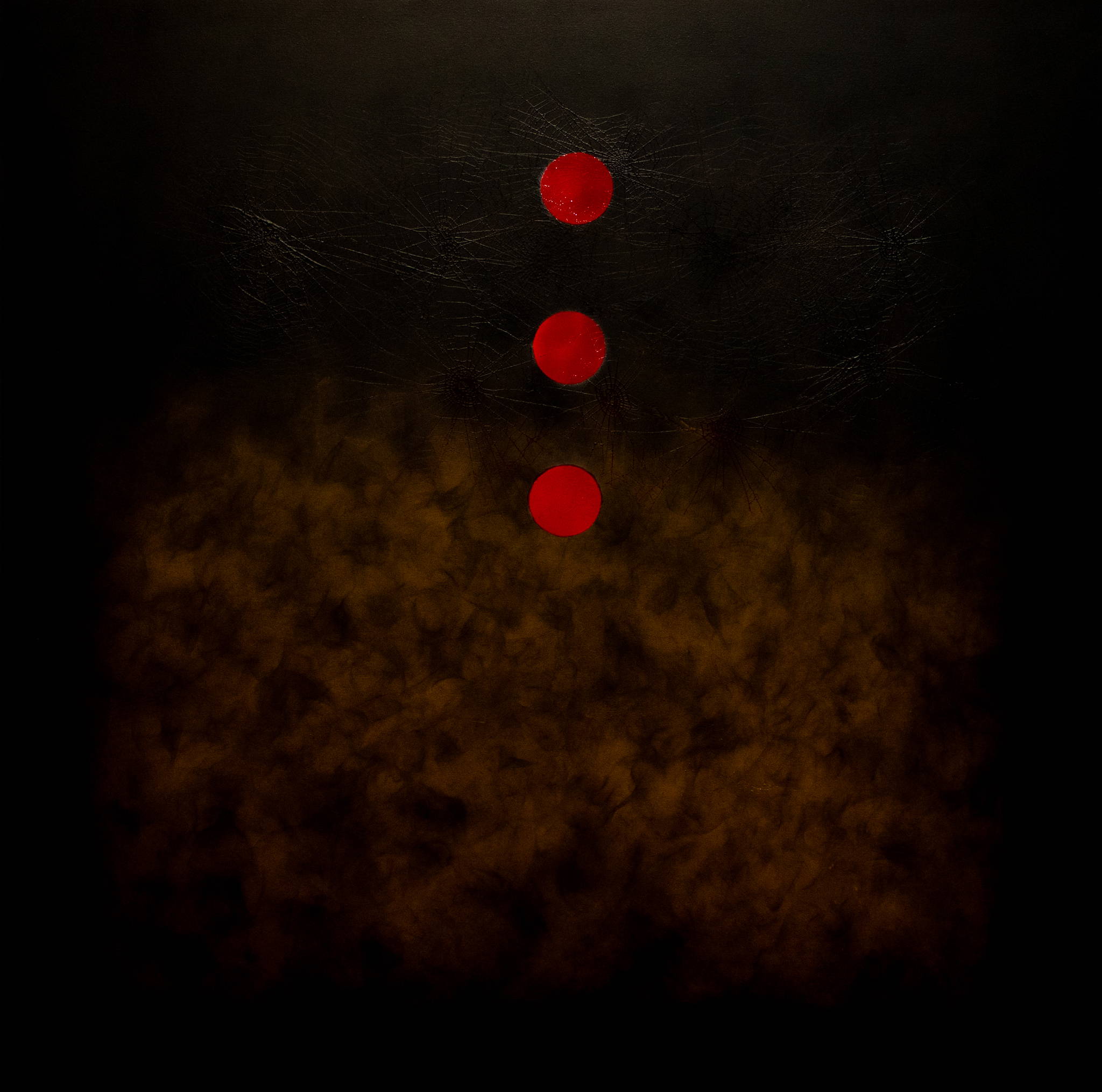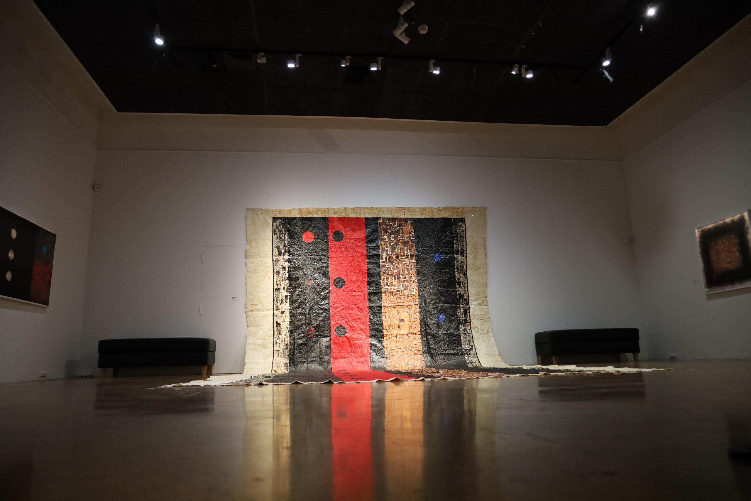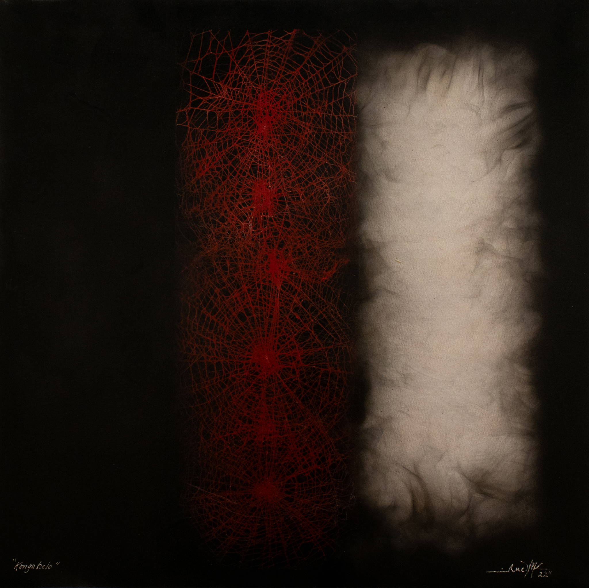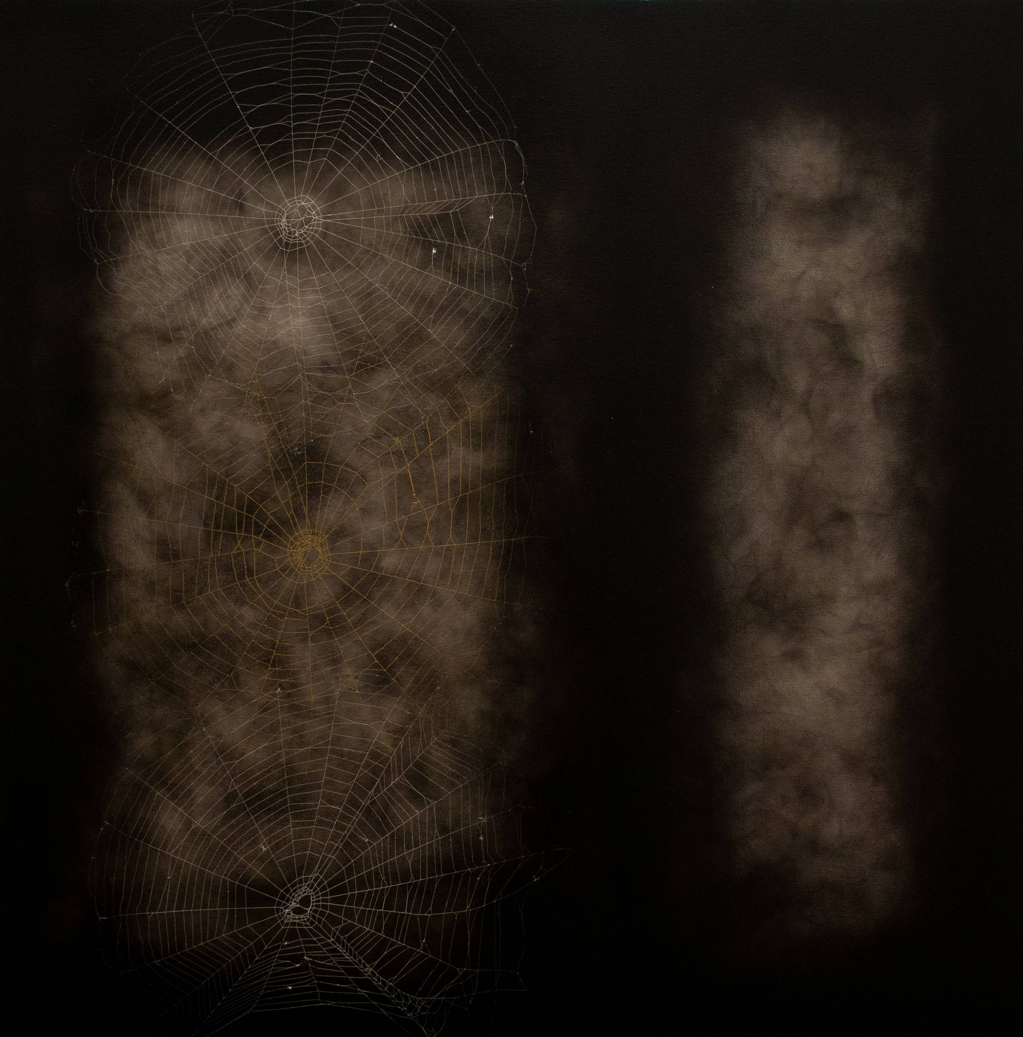 Maka’s art is often described as interdisciplinary, but the term scarcely captures the complexity of his method. He works at the intersection of painting, performance, ritual, and material culture. His blackened tapa works, sometimes vast in scale, are produced through processes that combine traditional barkcloth preparation with contemporary mark-making, fumage, and gestural abstraction. The resulting surfaces are dense, smoky, and atmospheric, evoking both the cosmological and the political. A particularly unusual feature of the works are the spiderwebs, carefully gathered, consolidated and applied to the surface as an extension of abstract form.