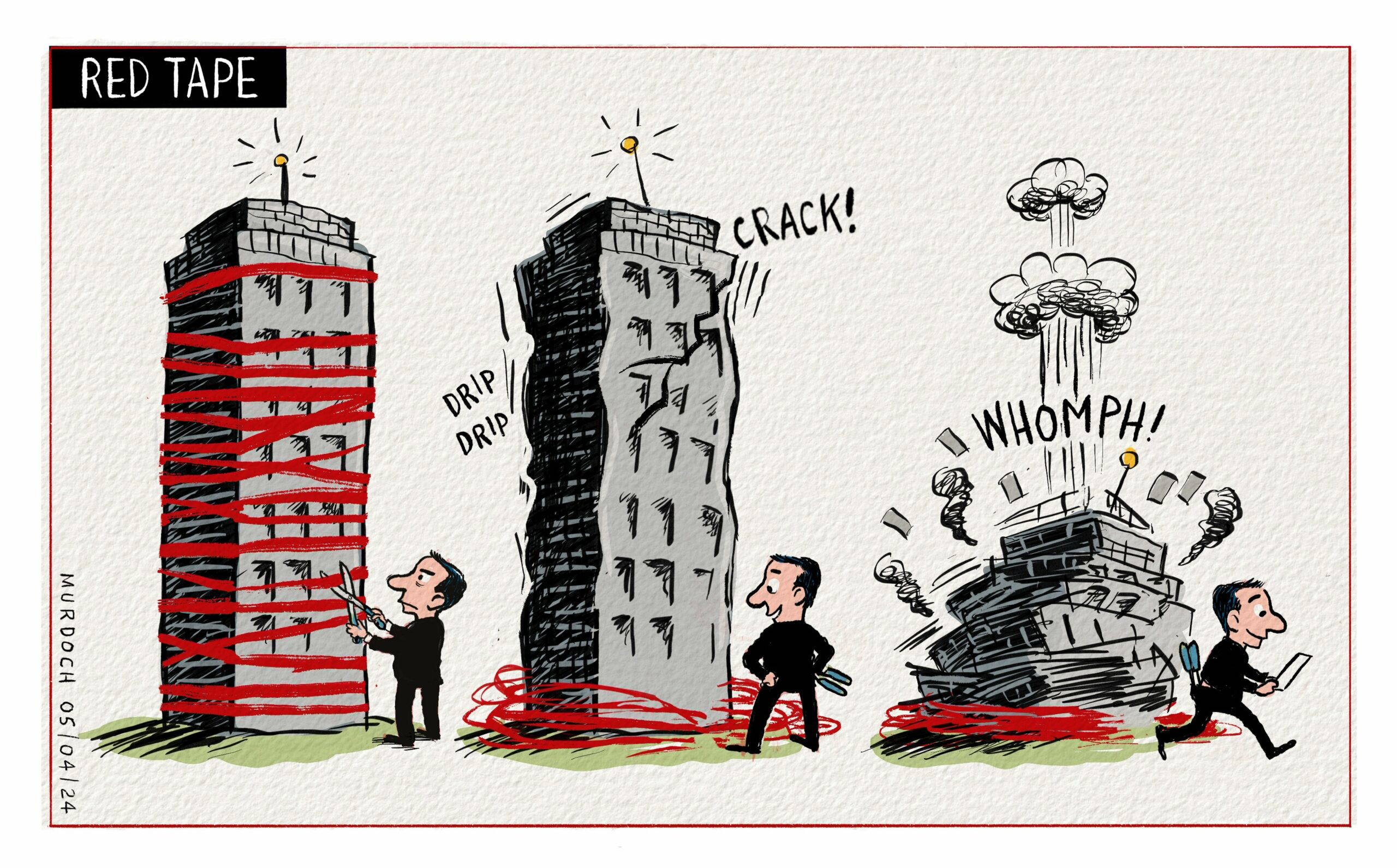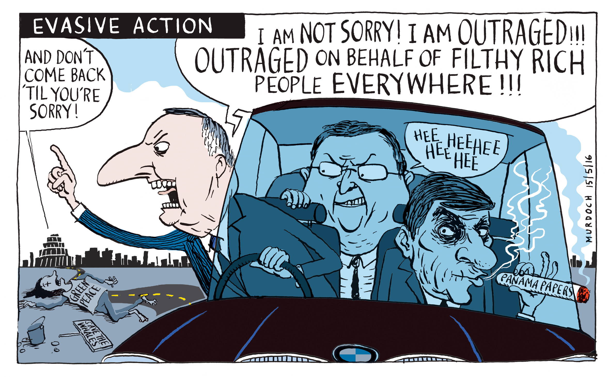 ‘There is a great thing about drawing the cartoons though: I make them small in my own head. I draw little hands, and little feet, and little heads, and have them shouting, or blowing up with fury, being pompous or withering, and being able to reduce their stories to kitchen tragedies. Domestic and manageable. Like a little puppet theatre. Of course that’s not what is happening real life, and that’s the real tragedy. Real people’s lives being messed with in some pretty profound ways.’