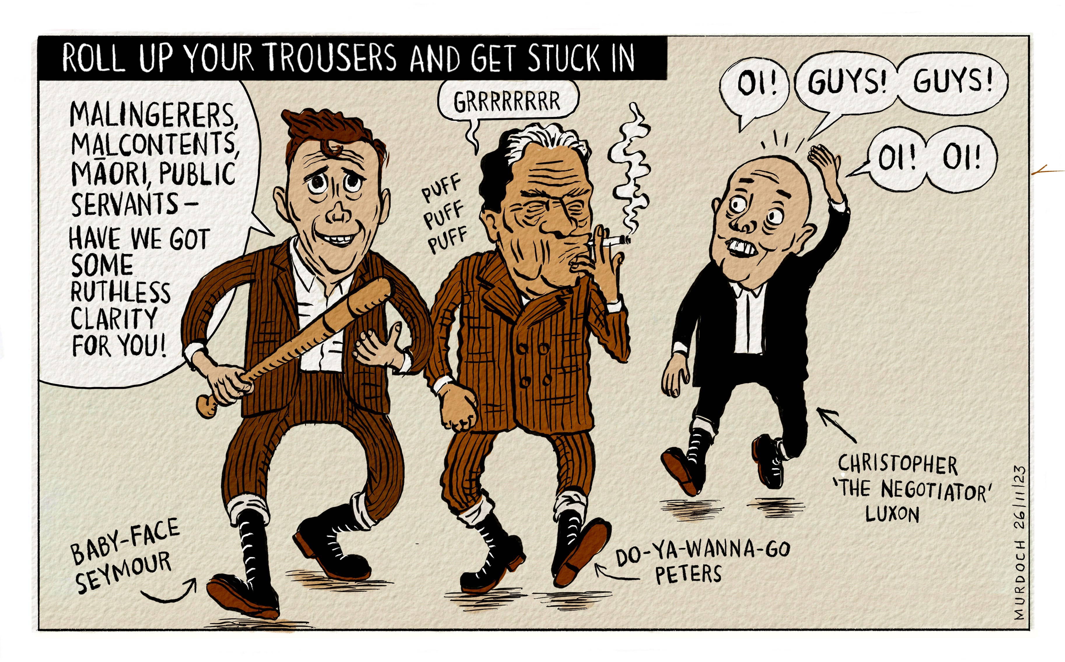 Trained as a graphic designer, she worked for several years with Wellington Media Collective, doing work for theatres, art galleries, education and the like. After a year in South Africa with a Xhosa women’s community development group (under the auspices of Volunteer Services Abroad), she took a job as a designer with Wellington’s daily paper, The Post. In 2013 she had her first foray into cartooning with the Munro the Cat series which now runs in all Stuff’s daily newspapers three days a week. As well as the Munro series, Murdoch is a political cartoonist with Stuff, producing work for the Sunday Star-Times, and twice a week for the daily papers in Stuff’s stable.
